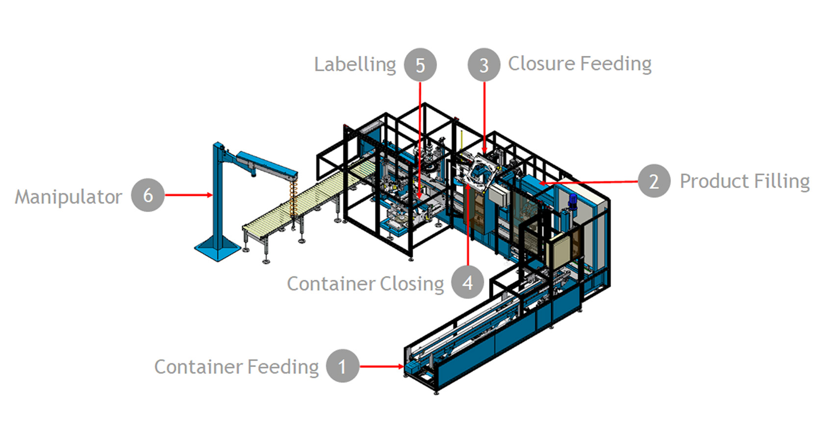 High precision, gravimetric filling lines, working on the principle of real time net weight product dosing. The empty containers are introduced on the load cell platform as they pass through the major arc of the dosing carousel’s rotation. The container’s arc path is divided into process phases.