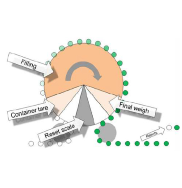 - Final check of the net weight: once the filling cycle has ended, the system checks the filled container to identify any net fill weight outside of the tolerance; a reject signal is generated for any unacceptable container.